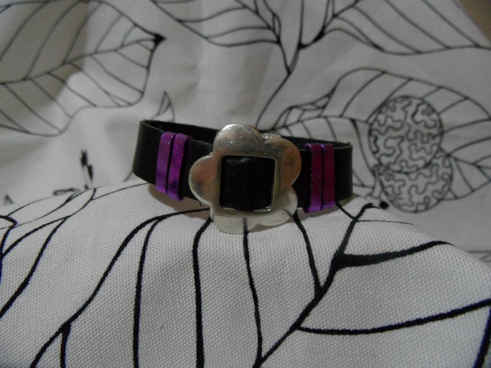 Pulsera en cola de ratón fucsia y negra con abalorios color plata colgando